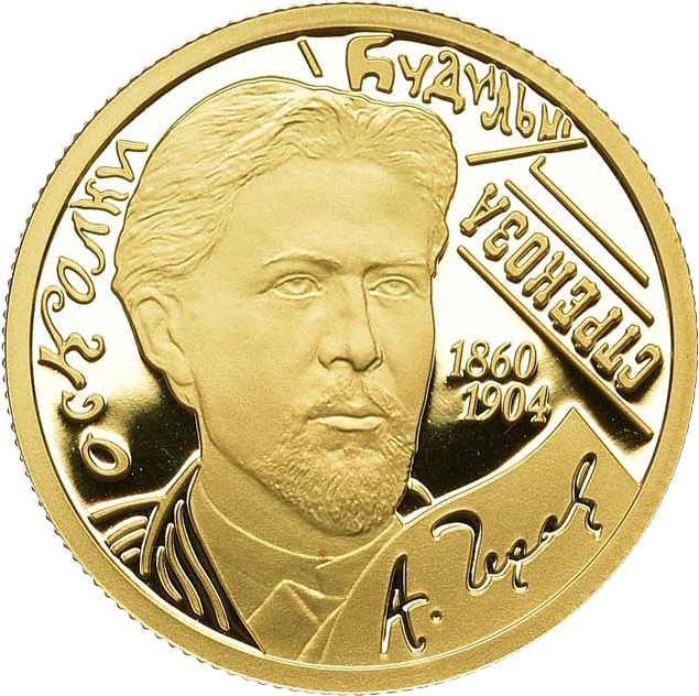 Описание: У центрі диска — портрет А. П. Чехова та дати у двох рядках: «1860» і «1904», навколо портрета — написи, що вказують назви журналів — ліворуч: «ОСКОЛКИ», зверху: «БУДИЛЬНИК», праворуч: «СТРЕКОЗА», нижче на матовому полі аркуша паперу — факсимільний підпис письменника: «А. ЧЕХОВ».
