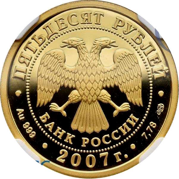 Описание: У центрі — емблема Банку Росії [двоголовий орел із опущеними крилами, під ним — напівкруглий напис «БАНК РОССИИ» (БАНК РОСІЇ)], обрамлена колом з крапок, а по краю — написи: зверху: «ПЯТЬДЕСЯТ РУБЛЕЙ» (П'ЯТДЕСЯТ РУБЛІВ), внизу: ліворуч – позначення дорогоцінного металу та його проби, в центрі – рік випуску «2007 г.» (2007), праворуч – вміст дорогоцінного металу та знак монетного двору.