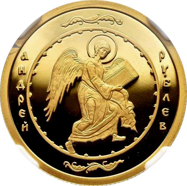 Описание: У центрі — зображення ангела в орнаментованому колі, ліворуч і праворуч від нього — вертикальні написи «Андрей» і «Рублев», зверху і знизу — стилізовані рослинні орнаменти.