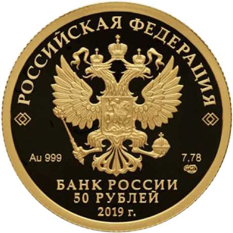 Описание: Рельєфне зображення державного герба Російської Федерації та написи: «РОССИЙСКАЯ ФЕДЕРАЦИЯ» (РОСІЙСЬКА ФЕДЕРАЦІЯ), «БАНК РОССИИ» (БАНК РОСІЇ), номінал монет «50 РУБЛЕЙ» (50 РУБЛІВ), рік випуску «2019 г.». (2019), позначення металу за періодичною системою елементів Д.І. Менделєєва, проба, товарний знак Санкт-Петербурзького монетного двору та вміст дорогоцінного металу.