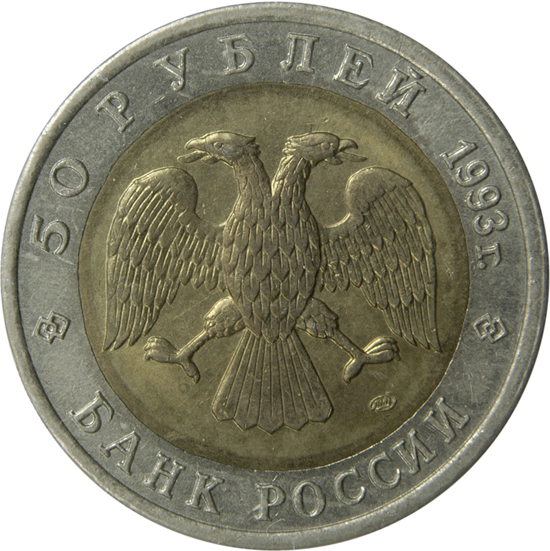 Описание: У центрі — емблема Банку Росії (двоголовий орел, створений художником І. Білібіним), під нею праворуч — знак монетного двору. Написи по краю: зверху — «ПЯТЬДЕСЯТ РУБЛЕЙ 1993 г.» (П'ЯТДЕСЯТ РУБЛІВ 1993), знизу — «БАНК РОССИИ» (БАНК РОСІЇ).