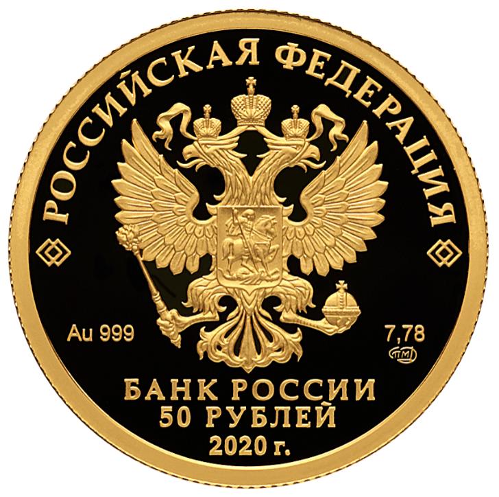 Описание: На дзеркальному полі диска зображено рельєфний герб Російської Федерації, над ним по краю розміщено напівкруглий напис «РОССИЙСКАЯ ФЕДЕРАЦИЯ» (РОСІЙСЬКА ФЕДЕРАЦІЯ), обрамлений з обох боків подвійними ромбами, під гербом зліва вказано дорогоцінний метал і його пробу, а праворуч — вміст дорогоцінного металу і знак монетного двору, внизу по центру трьома рядками розміщено напис «БАНК РОССИИ» (БАНК РОСІЇ), номінал монети і рік випуску «2020 г.» (2020).