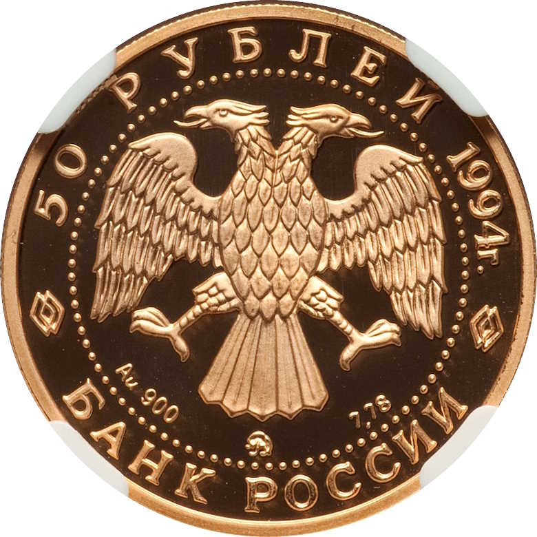 Описание: Двоголовий орел (дизайн І. Білібіна), літери під ним позначають метал, пробу, знак монетного двору та вміст дорогоцінного металу. Написи по краю: зверху — «50 РУБЛЕЙ 1994 г.» (50 РУБЛІВ 1994), знизу — «БАНК РОССИИ» (БАНК РОСІЇ).