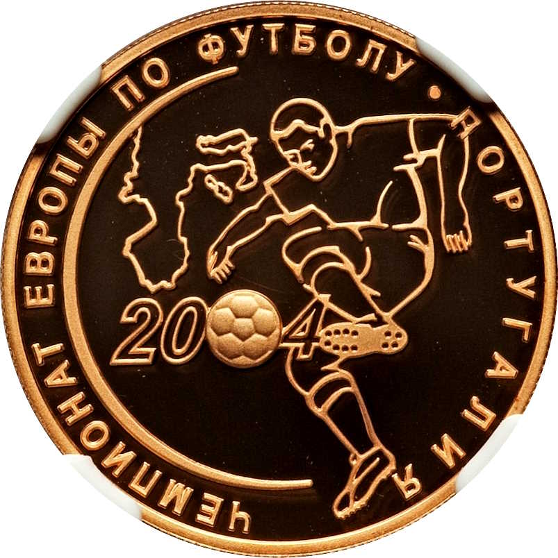 Описание: Зліва — контури Західної Європи, нижче футбольний м'яч, що є другою цифрою «0» дати «2004», праворуч — футболіст під час гри. Напис по краю: «ЧЕМПИОНАТ ЕВРОПЫ ПО ФУТБОЛУ • ПОРТУГАЛИЯ» («ЄВРОПЕЙСЬКИЙ ЧЕМПІОНАТ З ФУТБОЛУ • ПОРТУГАЛІЯ).