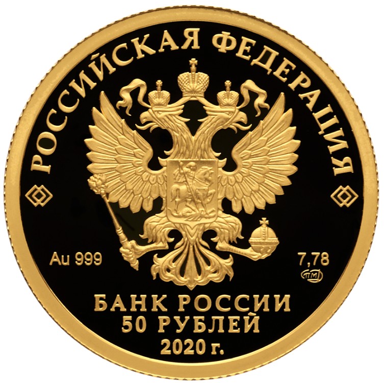 Описание: На дзеркальному полі диска зображено рельєфний герб Російської Федерації, над ним по колу розміщено напівкруглий напис «РОССИЙСКАЯ ФЕДЕРАЦИЯ» (РОСІЙСЬКА ФЕДЕРАЦІЯ), обрамлене з обох боків подвійними ромбами, нижче під гербом зліва вказано дорогоцінний метал і його пробу, а праворуч — вміст дорогоцінного металу і знак монетного двору, внизу по центру — трирядковий напис «БАНК РОССИИ» (БАНК РОСІЇ), номінал монети «50 РУБЛЕЙ» (50 РУБЛІВ) і рік випуску «2020 г.» (2020).