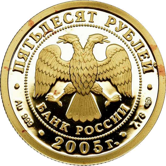 Описание: У центрі — емблема Банку Росії [двоголовий орел із розпростертими крилами, нижче — напівкруглий напис «БАНК РОССИИ» (БАНК РОСІЇ)], обрамлена колом з крапок і написів по краю: зверху — «ПЯТЬДЕСЯТ РУБЛЕЙ» (П'ЯТДЕСЯТ РУБЛІВ), внизу – рік випуску «2005», літери ліворуч позначають метал і пробу, праворуч – вміст дорогоцінного металу і знак монетного двору.