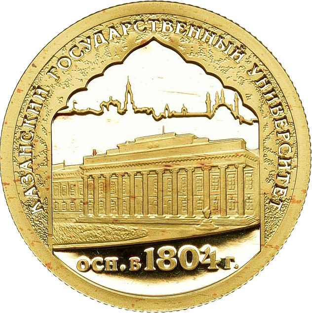Описание: У картуші на тлі контурів міста Казань — головна будівля університету з написом внизу «ОСН. В 1804 г.» (ЗАСНОВАНО В 1804 РОЦІ). Напис уздовж краю на матовому полі національного орнаменту: «КАЗАНСКИЙ ГОСУДАРСТВЕННЫЙ УНИВЕРСИТЕТ» (ДЕРЖАВНИЙ УНІВЕРСИТЕТ КАЗАНІ).