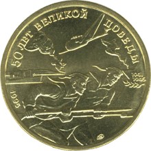 Описание: Група радянських військових моряків на тлі військового корабля та військового літака під час бойових дій, ліворуч — дві дати у двох рядках «1941» та «1945», лавровий гілок та рік карбування «1995 г.», нижче — знак монетного двору, напис у верхній частині вздовж краю — «50 ЛЕТ ВЕЛИКОЙ ПОБЕДЫ» (50-РІЧЧЯ ВЕЛИКОЇ ПЕРЕМОГИ).