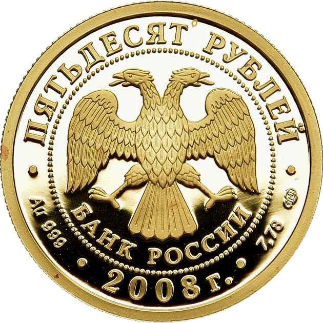 Описание: У центрі — емблема Банку Росії [двоголовий орел із опущеними крилами, під ним — напівкруглий напис «БАНК РОССИИ» (БАНК РОСІЇ)], обрамлена колом з крапок і написів по краю — зверху: «ПЯТЬДЕСЯТ РУБЛЕЙ» (П'ЯТДЕСЯТ РУБЛІВ), нижче: ліворуч - позначення дорогоцінного металу та його проби, в центрі - рік випуску «2008 г.» (2008), праворуч - вміст дорогоцінного металу та клеймо монетного двору.