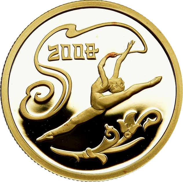 Описание: У центрі — спортсменка, яка виконує гімнастичні вправи зі стрічкою, внизу праворуч — рослинний орнамент, вгорі ліворуч — дата «2008», написана стилем китайських ієрогліфів.