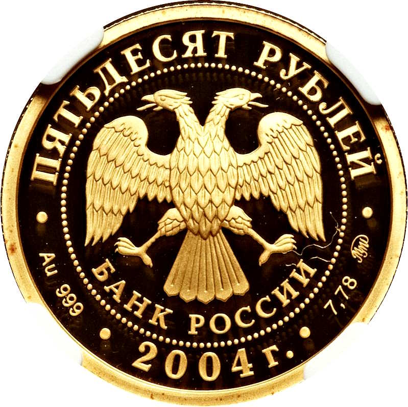 Описание: У центрі — емблема Банку Росії [двоголовий орел із опущеними крилами, нижче — напівкруглий напис — «БАНК РОССИИ» (БАНК РОСІЇ)] в обрамленні кола з крапок і написів по краю: зверху — «ПЯТЬДЕСЯТ РУБЛЕЙ» (П'ЯТДЕСЯТ РУБЛІВ), внизу – рік випуску «2004», літери ліворуч позначають метал і пробу, праворуч – вміст дорогоцінного металу і знак монетного двору.