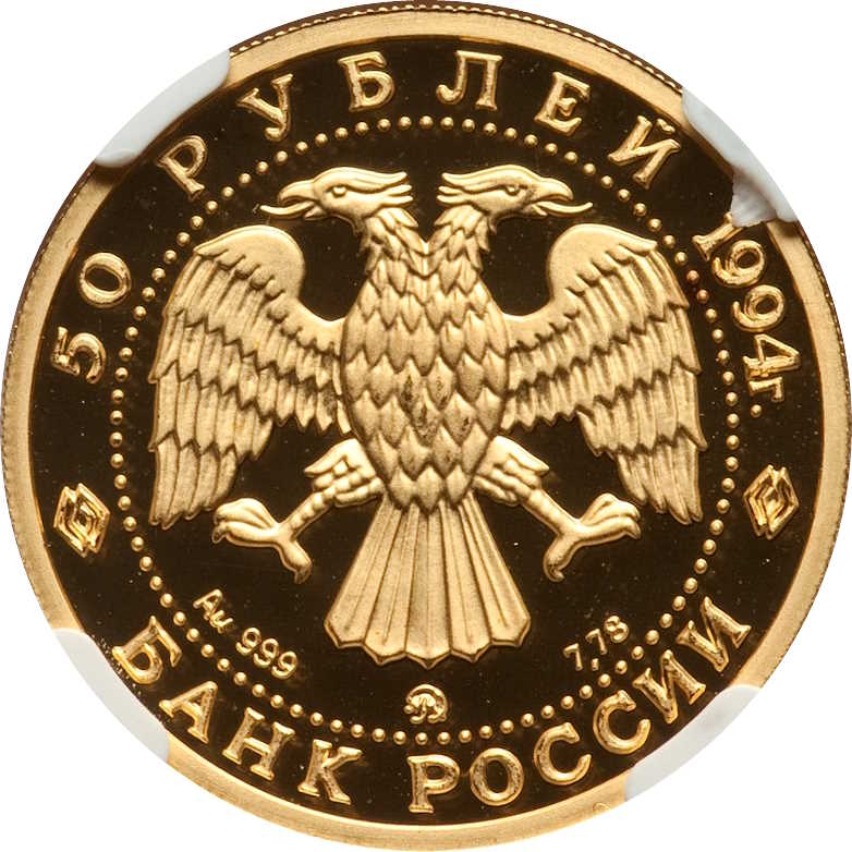 Описание: Двоголовий орел (дизайн І. Білібіна), літери під ним позначають метал, пробу, знак монетного двору та вміст дорогоцінного металу. Написи по краю: зверху — «50 РУБЛЕЙ 1994 г.» (50 РУБЛІВ 1994), знизу — «БАНК РОССИИ» (БАНК РОСІЇ).