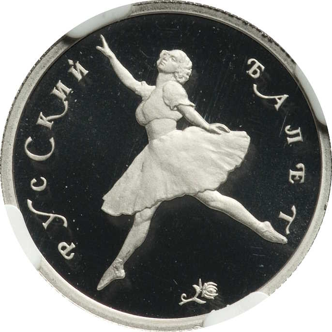 Описание: Танцююча балерина, напис по краю: «РУССКИЙ БАЛЕТ» (РОСІЙСЬКИЙ БАЛЕТ) та квітка.