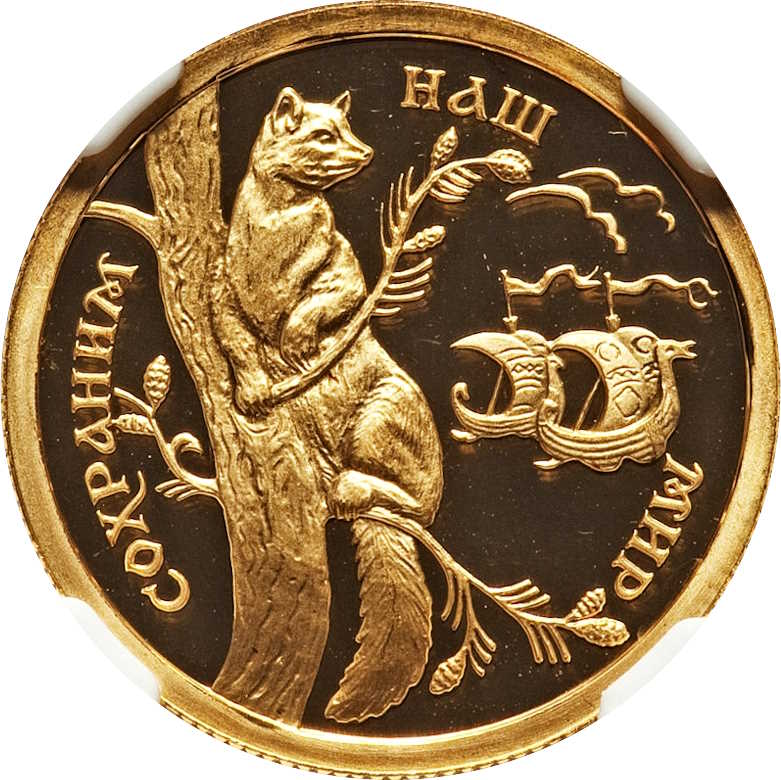 Описание: Соболь, що сидить на дереві, праворуч — два човни, напис по краю: «СОХРАНИМ НАШ МИР» (ЗБЕРЕЖЕМО НАШ СВІТ).
