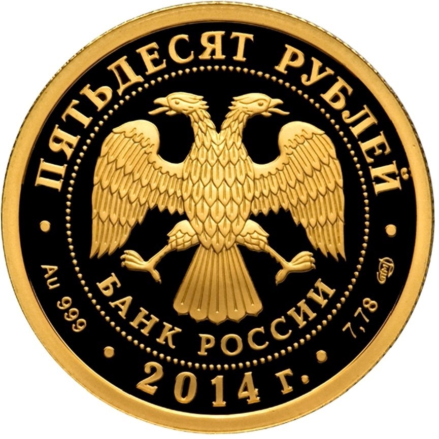 Описание: У центрі — емблема Банку Росії [двоголовий орел із опущеними крилами, під ним — напівкруглий напис «БАНК РОССИИ» (БАНК РОСІЇ)], обрамлена колом з крапок і написів по краю — зверху: «ПЯТЬДЕСЯТ РУБЛЕЙ» (П'ЯТДЕСЯТ РУБЛІВ), нижче: ліворуч - позначення дорогоцінного металу та його проби, в центрі - рік випуску, праворуч - вміст дорогоцінного металу та торговельна марка монетного двору.