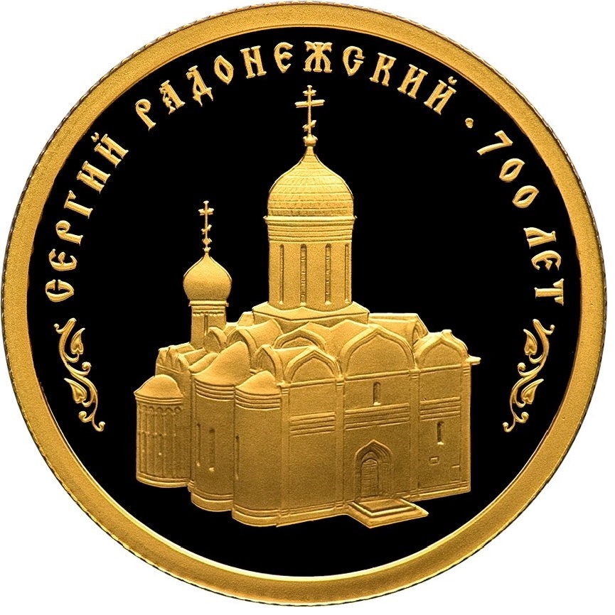 Описание: Рельєфне зображення Свято-Троїцького собору Свято-Троїцько-Сергієвої лаври, зверху по краю — напис: «СЕРГИЙ РАДОНЕЖСКИЙ • 700 ЛЕТ» (СЕРГІЙ РАДОНЕЖСЬКИЙ • 700 РОКІВ), обрамлений двома фрагментами орнаменту.