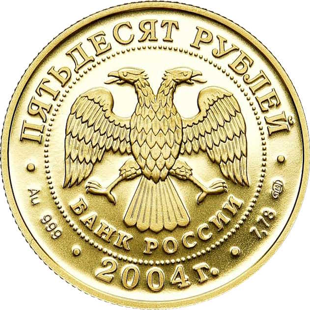 Описание: У центрі — емблема Банку Росії [двоголовий орел із розпростертими крилами, нижче — напівкруглий напис — «БАНК РОССИИ» (БАНК РОСІЇ)] в обрамленні кола з крапок і написів по краю: зверху — «ПЯТЬДЕСЯТ РУБЛЕЙ» (П'ЯТДЕСЯТ РУБЛІВ), внизу – рік випуску «2004», літери ліворуч позначають метал і пробу, праворуч – вміст дорогоцінного металу і знак монетного двору.
