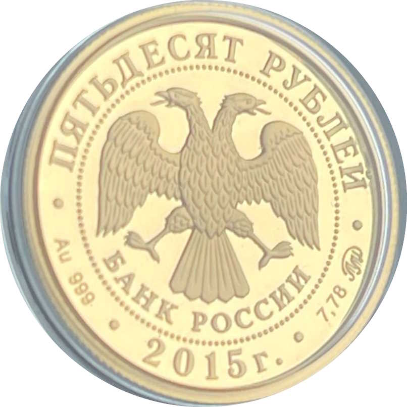 Описание: У центрі — емблема Банку Росії [двоголовий орел із опущеними крилами, під ним — напівкруглий напис «БАНК РОССИИ» (БАНК РОСІЇ)], обрамлена колом з крапок і написів по краю — зверху: «ПЯТЬДЕСЯТ РУБЛЕЙ» (П'ЯТДЕСЯТ РУБЛІВ), нижче: ліворуч – позначення дорогоцінного металу та його проби, у центрі – рік випуску «2015 г.» (2015), праворуч – вміст дорогоцінного металу та знак монетного двору.
