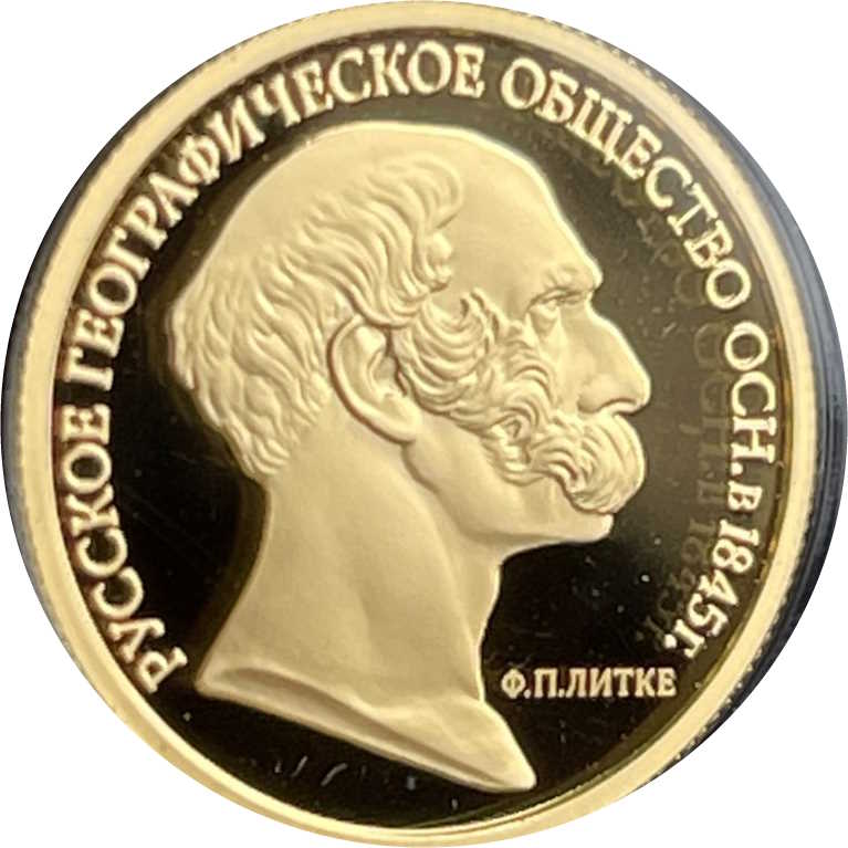 Описание: У центрі диска на дзеркальному полі — профільний портрет Ф.П. Літке, праворуч від нього внизу — напис: «Ф.П. ЛИТКЕ», напис зверху вздовж краю: «РУССКОЕ ГЕОГРАФИЧЕСКОЕ ОБЩЕСТВО ОСН. в 1845 г.». (РОСІЙСЬКЕ ГЕОГРАФІЧНЕ ТОВАРИСТВО ЗАСНОВЛЕНО. у 1845 р.).