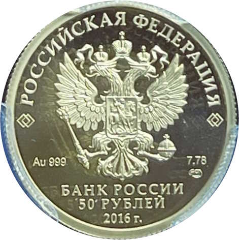 Описание: Рельєфне зображення Державного герба Російської Федерації. Є написи: «РОССИЙСКАЯ ФЕДЕРАЦИЯ» (РОСІЙСЬКА ФЕДЕРАЦІЯ), «БАНК РОССИИ» (БАНК РОСІЇ), номінал монети — «50 РУБЛЕЙ» (50 РУБЛІВ) і рік — «2016», позначення металу відповідно до періодичної системи елементів Д.І. Менделєєва, проба, торгова марка монетного двору Санкт-Петербурга та вміст дорогоцінного металу.