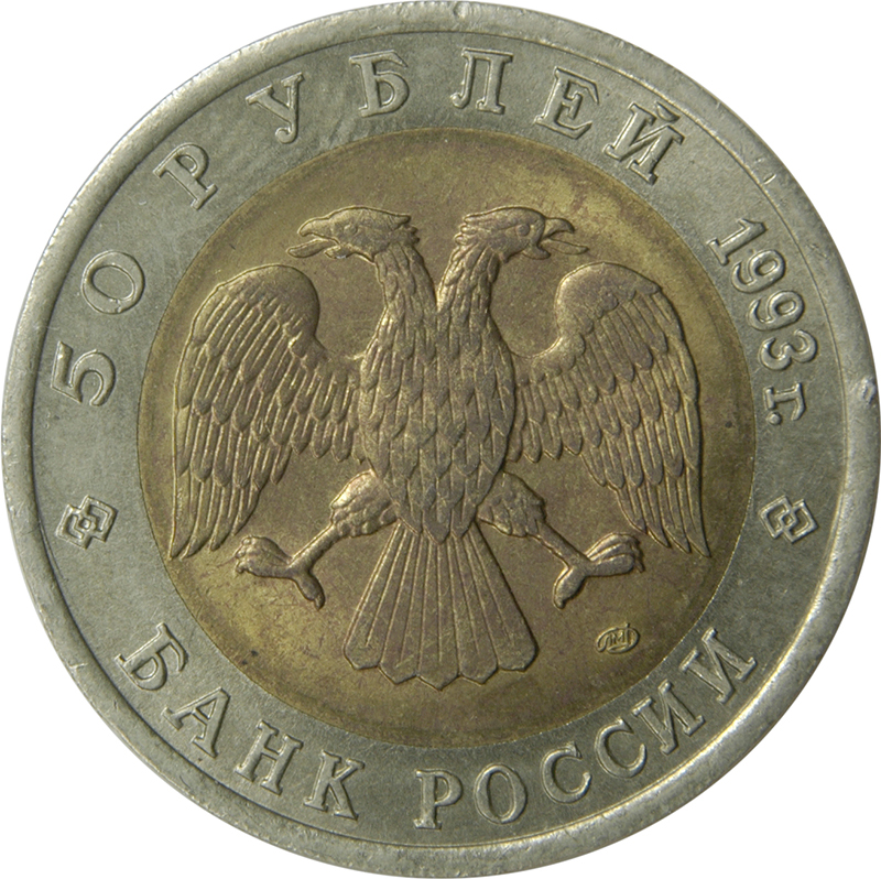 Описание: У центрі — емблема Банку Росії (двоголовий орел, створений художником І. Білібіним), під нею праворуч — знак монетного двору. Написи по краю: зверху — «ПЯТЬДЕСЯТ РУБЛЕЙ 1993 г.» (П'ЯТДЕСЯТ РУБЛІВ 1993), знизу — «БАНК РОССИИ» (БАНК РОСІЇ).