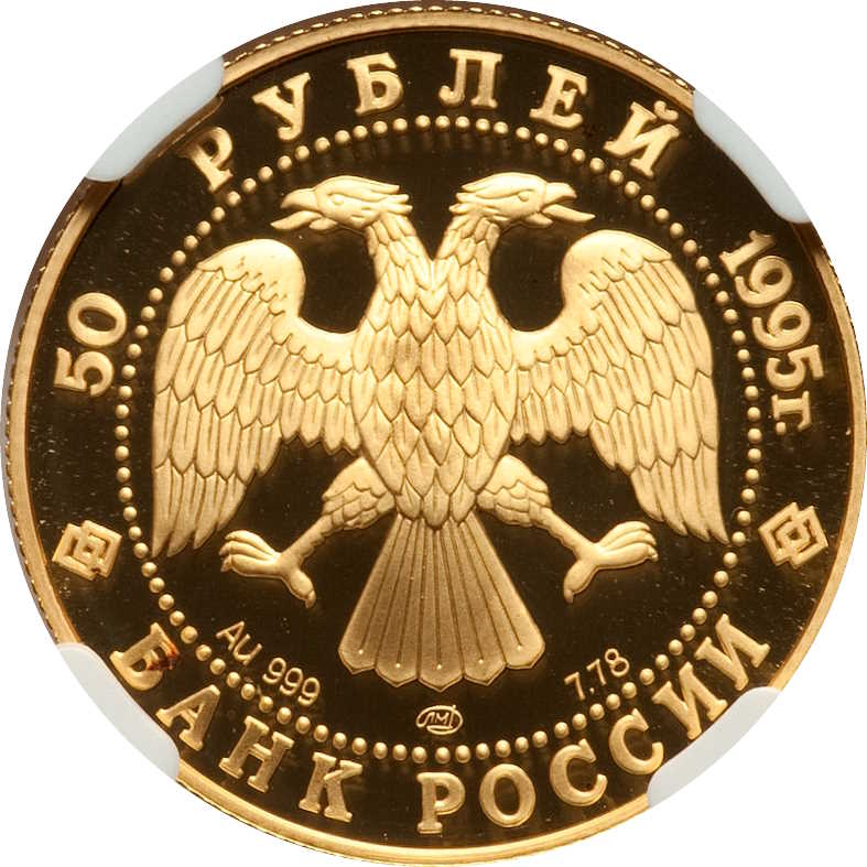 Описание: У центрі — емблема Банку Росії (двоголовий орел, створений І. Білібіним), під нею літери, що позначають метал, пробу, знак монетного двору та вміст дорогоцінного металу. Написи по краю, обрамлені колом з крапок: зверху — «50 РУБЛЕЙ 1995 г.» (50 РУБЛІВ 1995), знизу — «БАНК РОССИИ» (БАНК РОСІЇ).