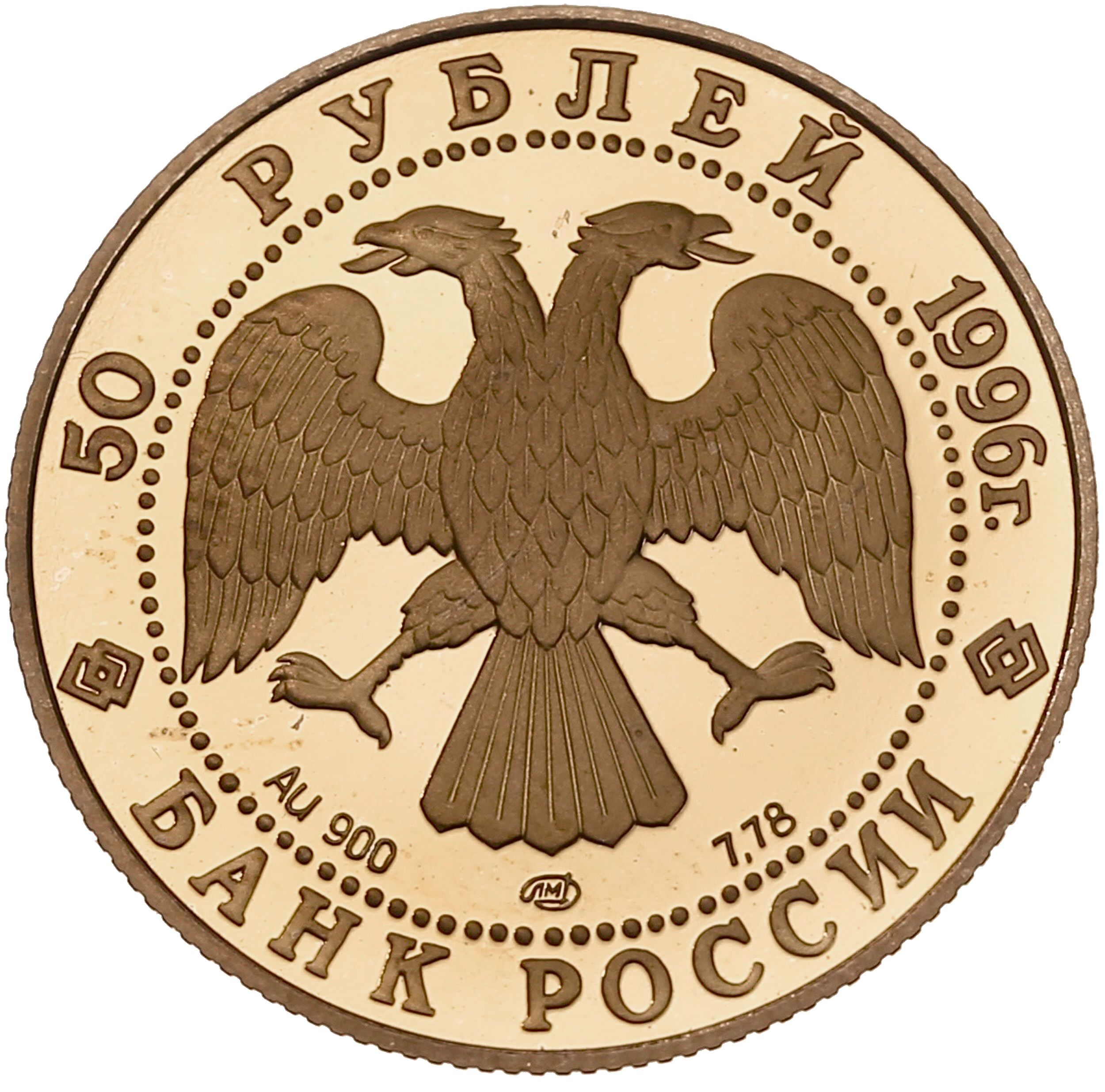 Описание: Двоголовий орел, створений художником І. Білібіним. Написи по краю: зверху — «50 РУБЛЕЙ 1996 г.» (50 РУБЛІВ 1996), знизу — «БАНК РОССИИ» (БАНК РОСІЇ). Літери нижче позначають металевий знак, пробу, знак монетного двору та вміст дорогоцінного металу.