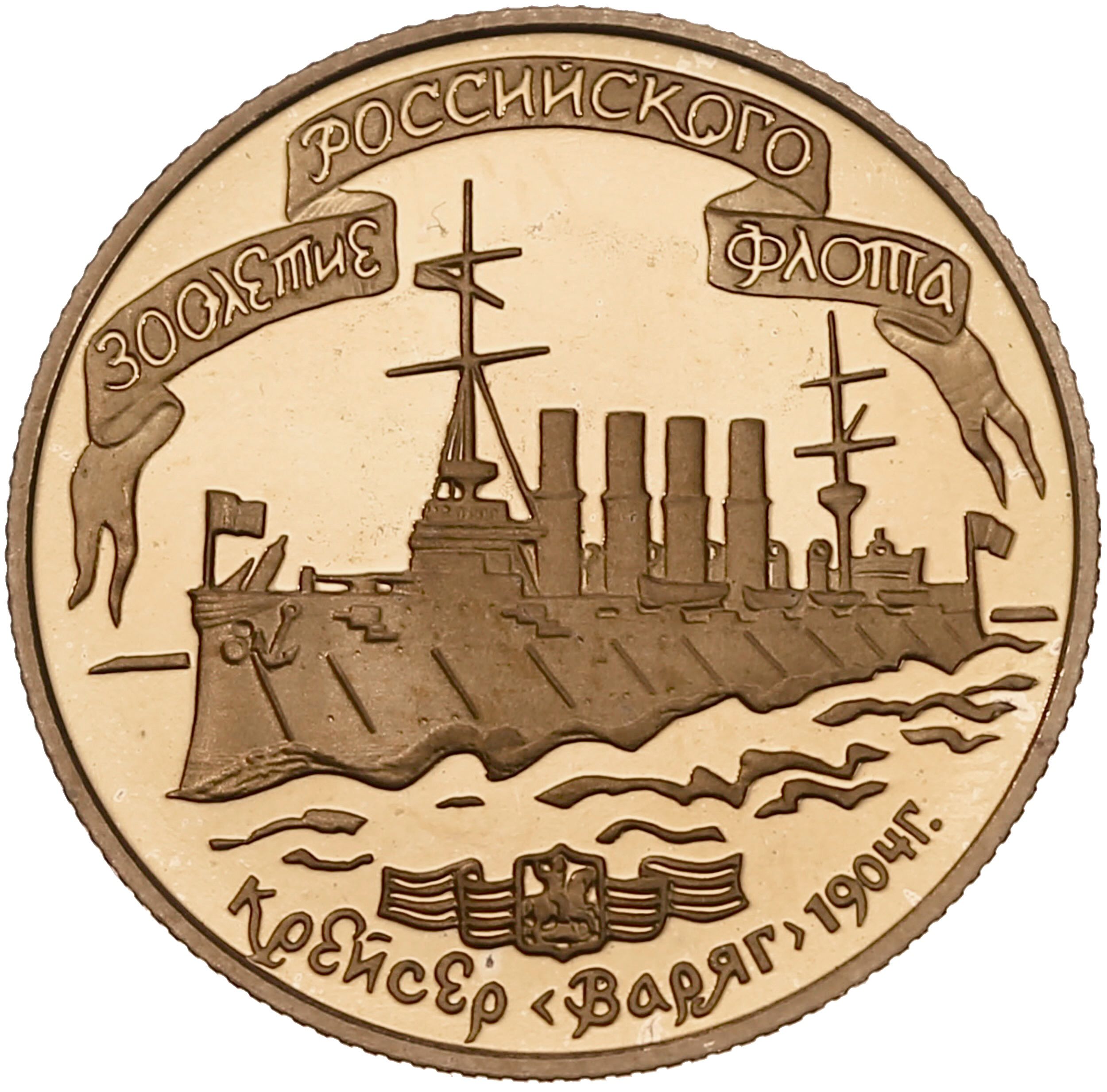 Описание: Крейсер «ВАРЯГ» з гербом на стрічці під ним. Написи по краю: вгорі на стрічці — «300-ЛЕТИЕ РОССИЙСКОГО ФЛОТА» (300-РІЧЧЯ РОСІЙСЬКОГО ФЛОТУ), внизу — «КРЕЙСЕР «ВАРЯГ» 1904 г.» (КРЕЙСЕР «ВАРЯГ» 1904 р.).
