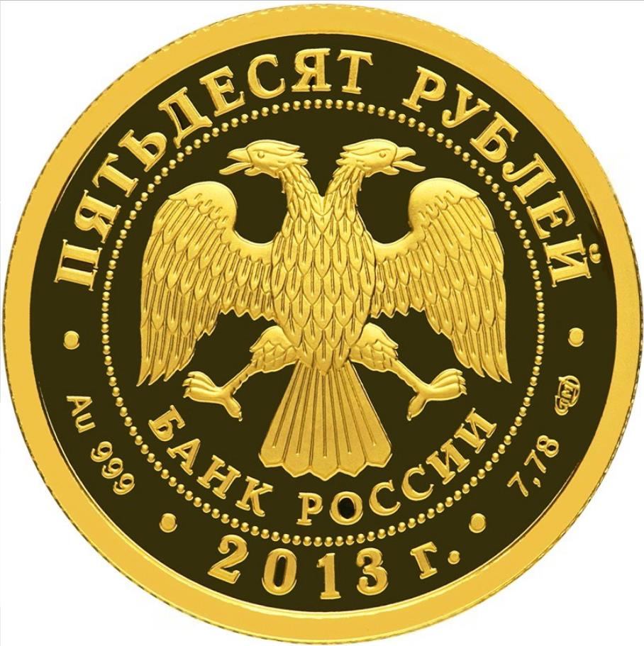 Описание: У центрі — емблема Банку Росії [двоголовий орел із опущеними крилами, під ним — напівкруглий напис «БАНК РОССИИ» (БАНК РОСІЇ)], обрамлена колом з крапок і написів по краю — зверху: «ПЯТЬДЕСЯТ РУБЛЕЙ» (П'ЯТДЕСЯТ РУБЛІВ), нижче: ліворуч - позначення дорогоцінного металу та його проби, у центрі - рік випуску «2013 г.» (2013), праворуч - вміст дорогоцінного металу та знак монетного двору.
