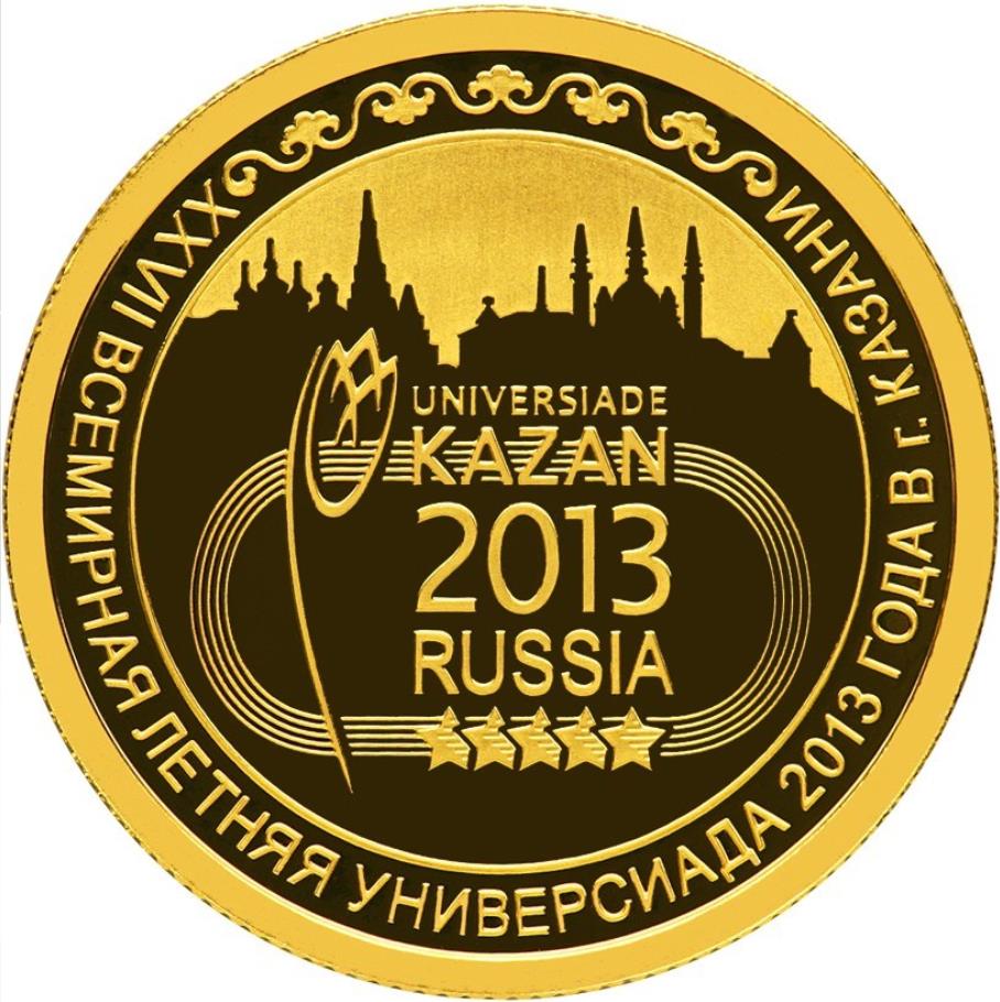 Описание: На дзеркальному полі диска в центрі, на тлі контурів бігових доріжок стадіону — логотип Універсіади (напис у чотири рядки: «UNIVERSIADE KAZAN 2013 RUSSIA», виконаний шрифтом різного розміру, з п'ятьма зірочками під ним) та емблема Універсіади (стилізоване графічне зображення тюльпана), розташована ліворуч від логотипу, вище — контурні обриси міста з куполами соборів та мінаретами; на смузі вздовж концентричної лінії, що утворює край, - напис, що йде зліва направо: «XXVII ВСЕМИРНАЯ ЛЕТНЯЯ УНИВЕРСИАДА 2013 ГОДА В Г. КАЗАНИ» (XXVII СВІТОВА ЛІТНЯ УНІВЕРСІАДА 2013 РОКУ В МІСТІ КАЗАНІ), доповнений зверху рослинним орнаментом.
