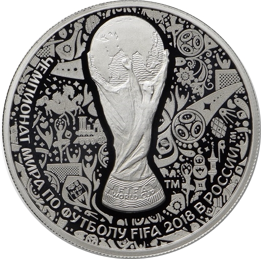 Описание: Зображення трофея Чемпіонату світу з футболу FIFA на тлі, що поєднує два типи натхнення: культурну та фольклорну спадщину Росії та візуальний світ футболу. По периметру є напис — «ЧЕМПИОНАТ МИРА ПО ФУТБОЛУ FIFA 2018 В РОССИИ» (ЧЕМПІОНАТ СВІТУ З ФУТБОЛУ FIFA 2018 У РОСІЇ).