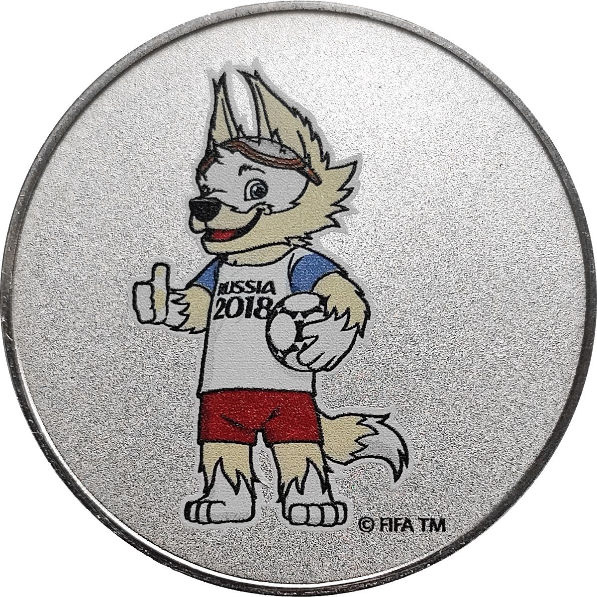 Описание: Офіційний талісман Чемпіонату світу з футболу 2018 року — вовк на ім'я Забівака (з російської «той, хто забиває»). Він зображений у вигляді антропоморфного вовка в коричнево-білій вовняній футболці з написом «RUSSIA 2018» та помаранчевих спортивних окулярах. Поєднання білого, синього та червоного кольорів футболки та шортів — це національні кольори російської команди.