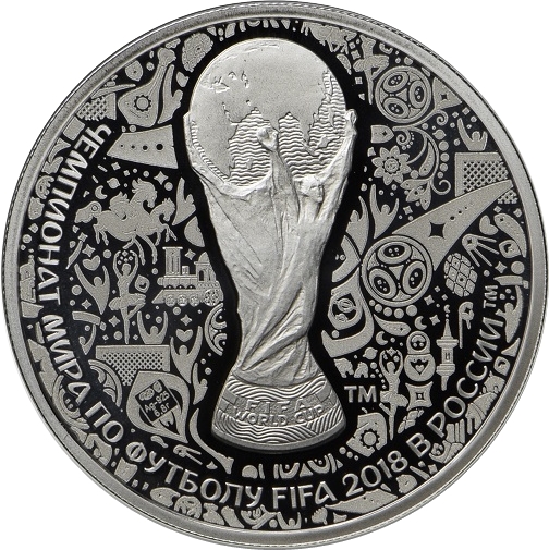 Описание: Зображення трофея Чемпіонату світу з футболу FIFA на тлі, що поєднує два типи натхнення: культурну та фольклорну спадщину Росії та візуальний світ футболу. По периметру є напис — «ЧЕМПИОНАТ МИРА ПО ФУТБОЛУ FIFA 2018 В РОССИИ» (ЧЕМПІОНАТ СВІТУ З ФУТБОЛУ FIFA 2018 У РОСІЇ).