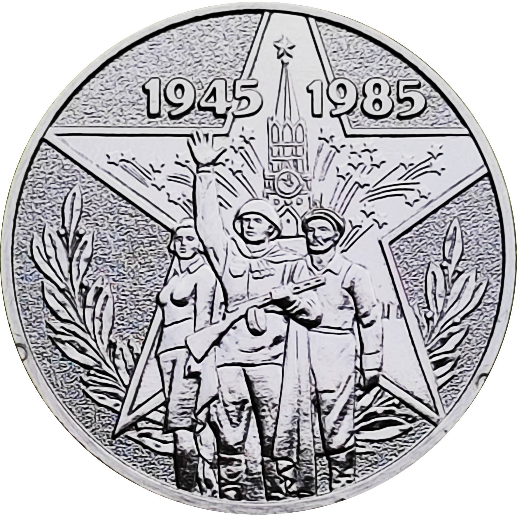 Описание: На аверсі медалі на тлі п'ятикутної зірки, лаврових гілок і вогнів святкового салюту на честь перемоги радянського народу у Великій Вітчизняній війні зображені скульптурні групи солдата, робітника, колгоспника і Спаська вежа Московського Кремля; у верхній частині — дати «1945» і «1985».