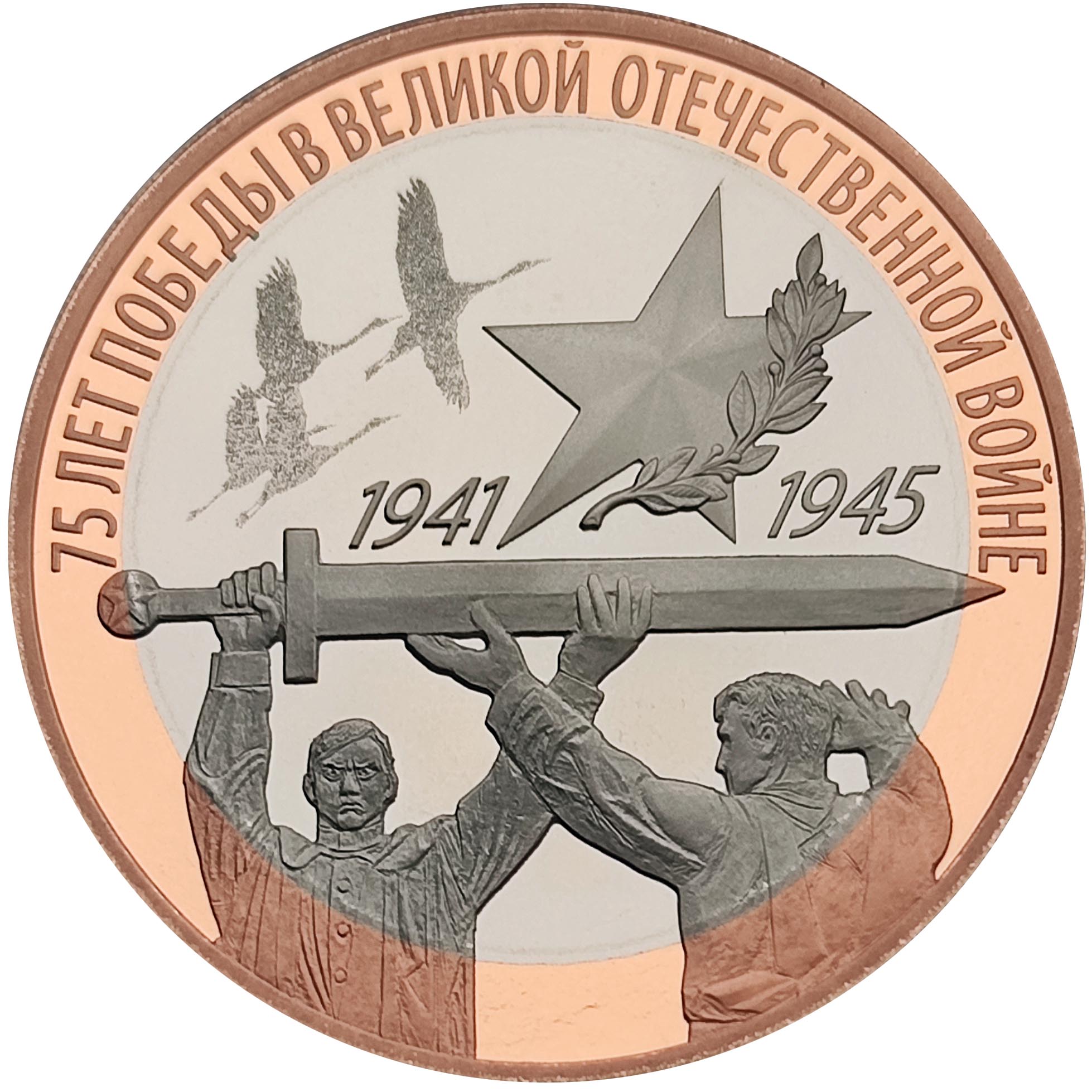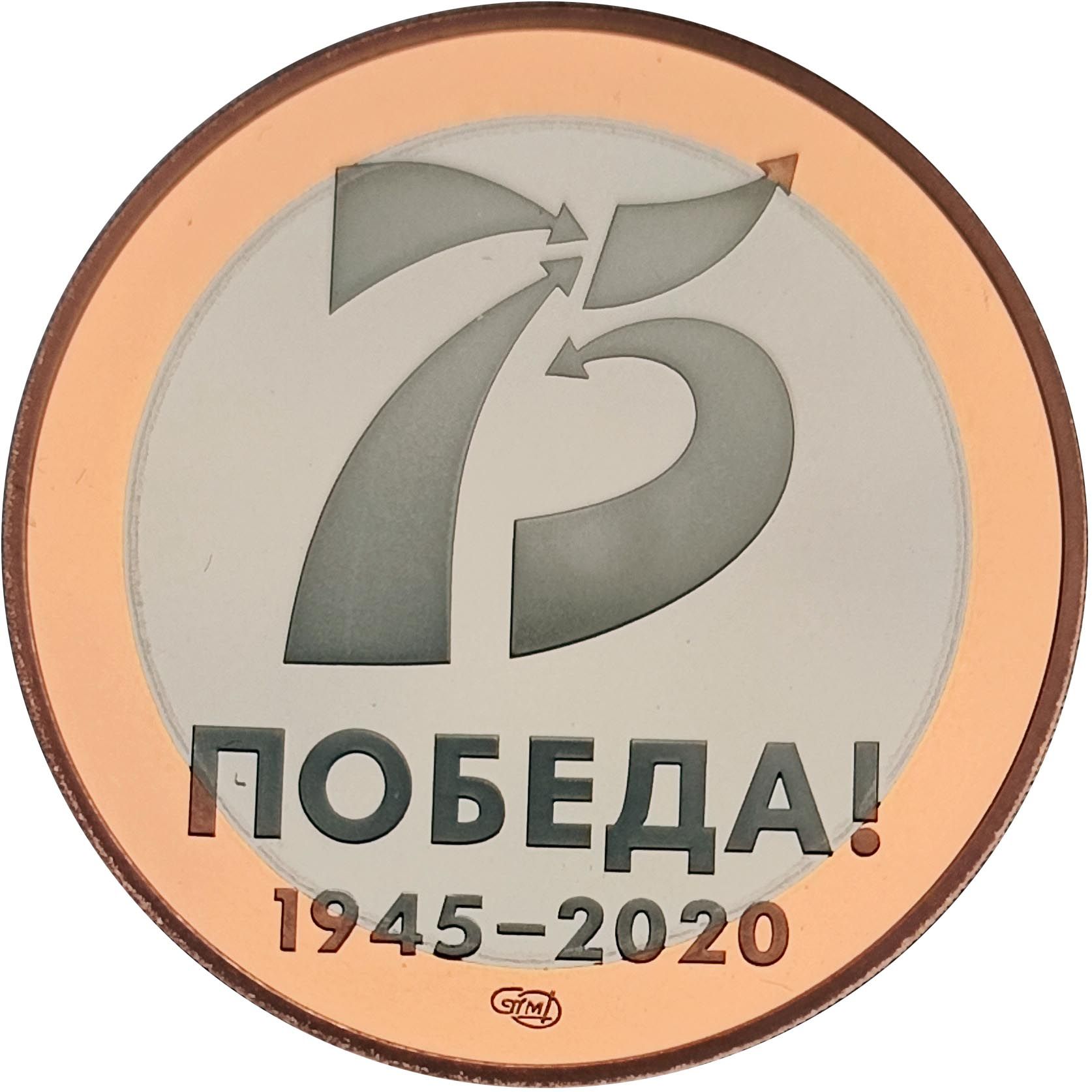 Описание: Зображено логотип святкування 75-ї річниці Перемоги у Великій Вітчизняній війні та клеймо Санкт-Петербурзького монетного двору.