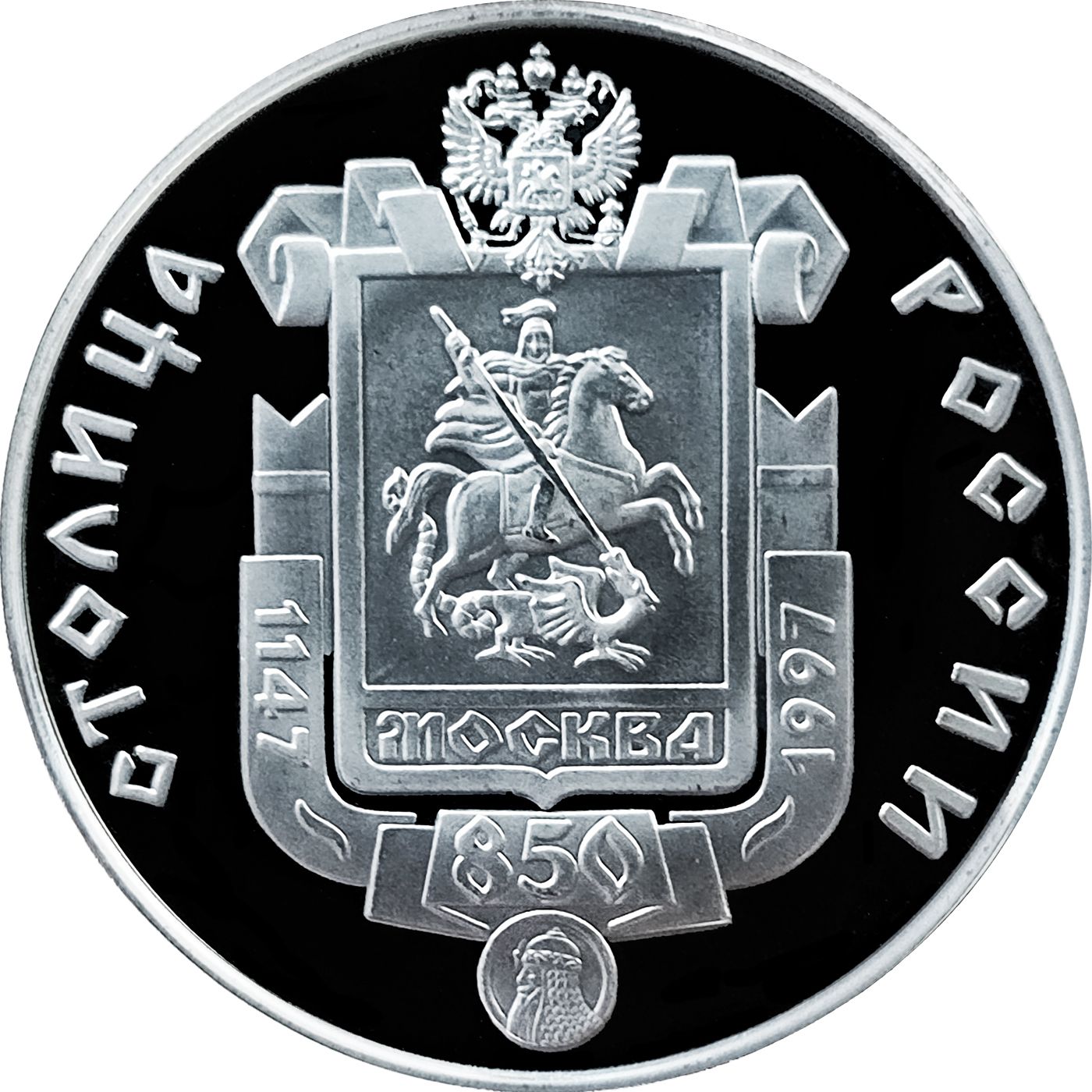 Описание: У центрі — герб Москви. Зверху — герб Російської Федерації. Знизу — медаль «На згадку про 800-річчя Москви» — перша радянська медаль, присвячена ювілею міста. На ній зображено рельєфний профіль голови князя Юрія Долгорукого в шоломі. Написи розташовані по краю медалі та на стрічках, що оточують герб.