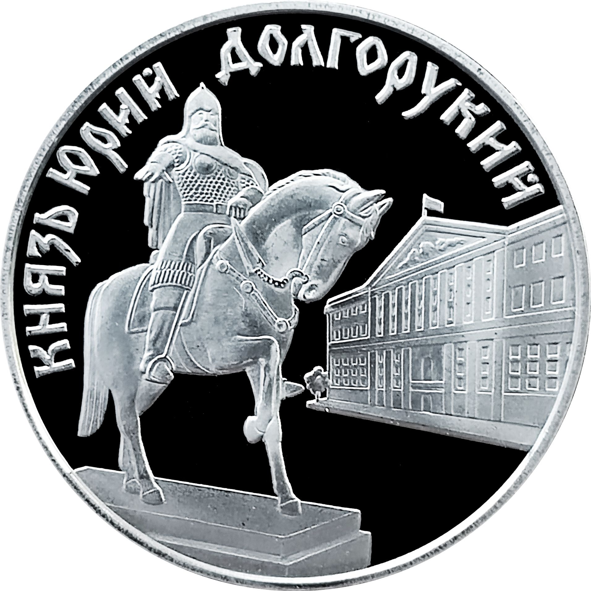 Описание: На монеті зображено пам'ятник засновнику Москви, князю Юрію Долгорукому, верхи на коні.