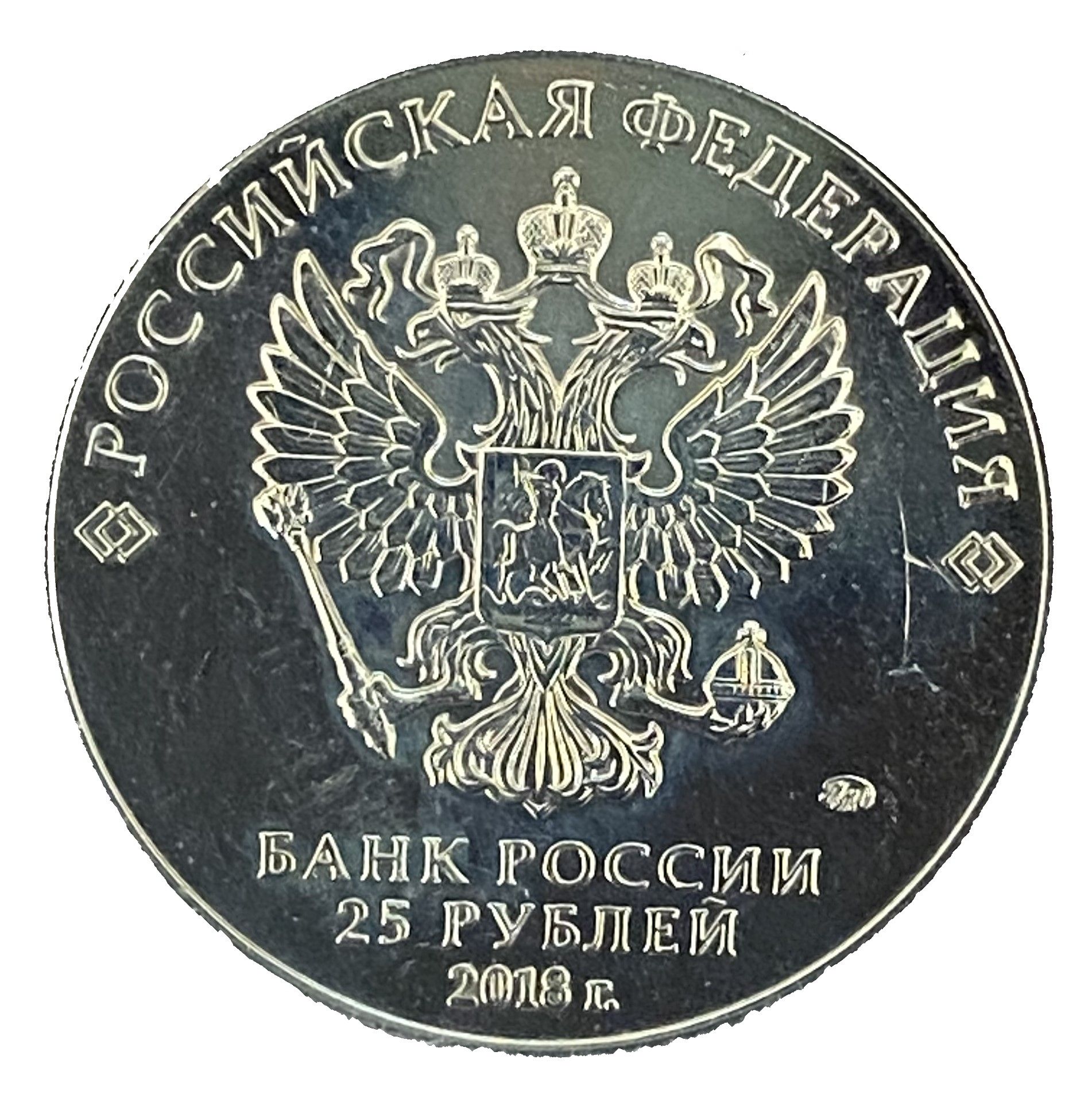 Описание: На монеті зображено рельєфний герб Російської Федерації, над ним напівкруглий напис «РОССИЙСКАЯ ФЕДЕРАЦИЯ» (РОСІЙСЬКА ФЕДЕРАЦІЯ). Є написи в три рядки: «БАНК РОССИИ» (БАНК РОСІЇ), номінал монети — «25 РУБЛЕЙ» (25 РУБЛІВ) і рік — «2018», торгова марка Монетного двору праворуч.