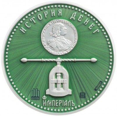 Описание: На зворотному боці медалі на зеленому тлі розміщена перша монета Петра I, відома як «соняшник». На монеті зображено профільний портрет Петра I, обрамлений круговим написом: «Петр I, імператор і самодержець всієї Росії». Зверху — назва колекції, знизу — торгова марка бренду, логотип «Imperial» та комбінований бренд. Під монетою зображено гвинтовий прес, що символізує процес карбування.
