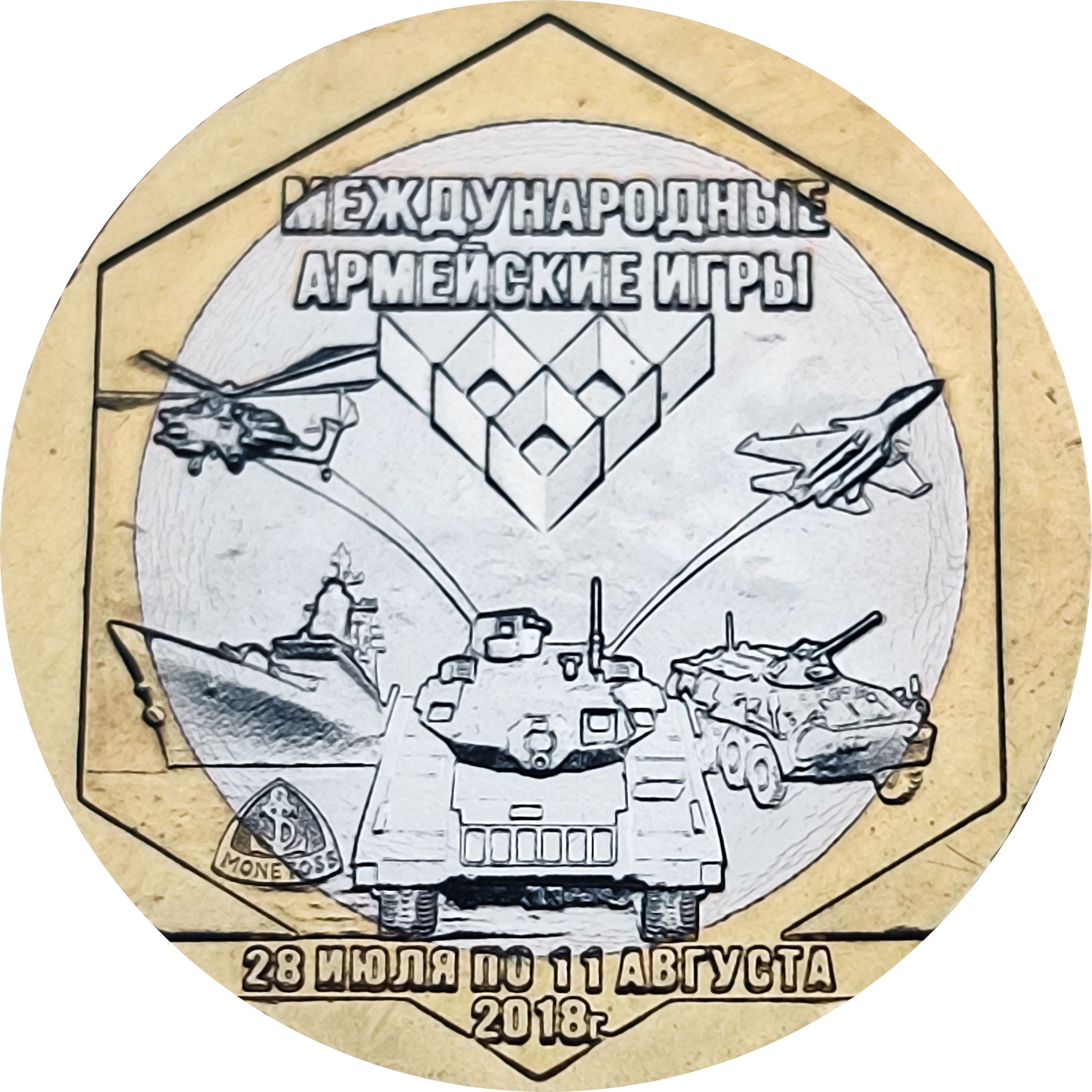 Описание: На зображенні зображені символи, пов'язані з Міжнародними армійськими іграми 2018 року. Емблема Ігор розташована в центрі, оточена військовою технікою: танком, вертольотом, літаком, бронетранспортером і кораблем. Назва змагань вказана вгорі, а дати та логотип проекту Monetoss вказані нижче.