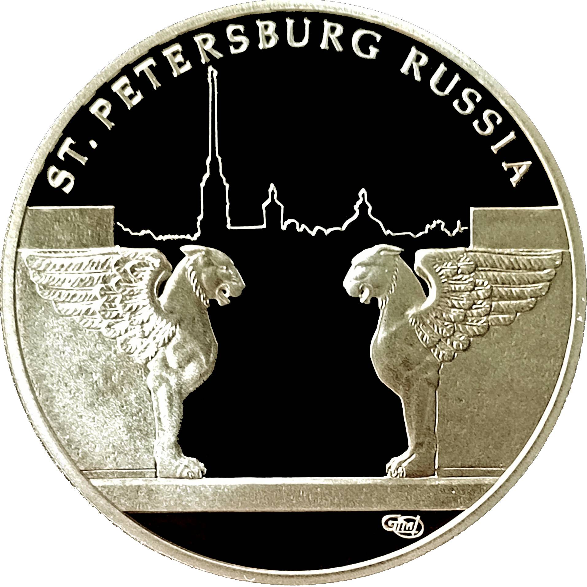 Описание: Силует Петропавлівської фортеці, бронзові грифони на Університетській набережній у Санкт-Петербурзі, знак монетного двору та написи.