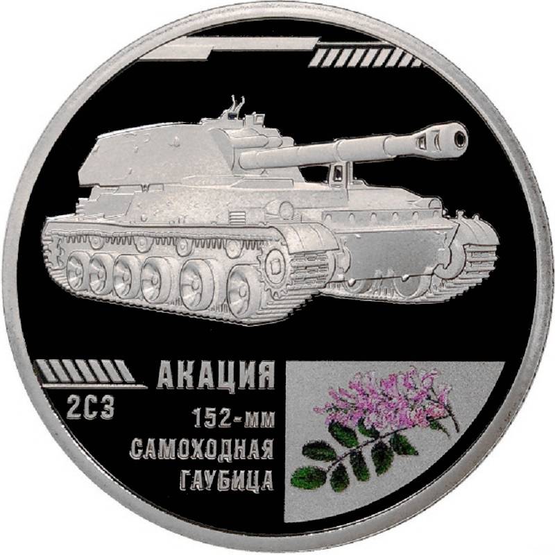 Описание: Зображення 2S3 «Акація» — радянська 152-мм дивізійна самохідна гаубиця. А також кольорове зображення відповідної квітки та напис.