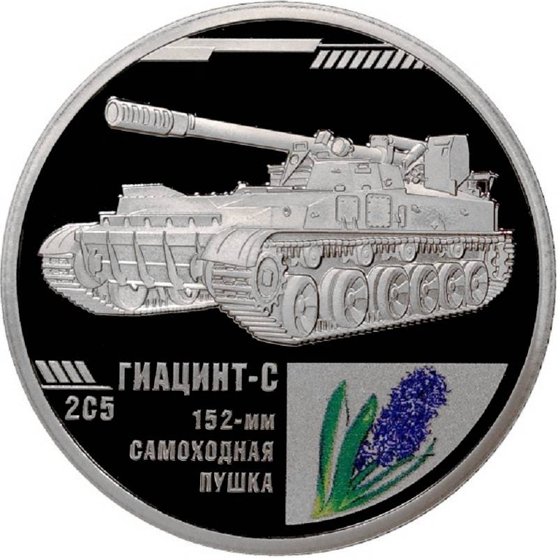 Описание: Зображення 2С5 «Гіацинт-С» — радянська 152-мм армійська самохідна гармата. Модифікація «С» означає самохідну, є також версія «Б» — буксирувана. А також кольорове зображення відповідної квітки та напис.