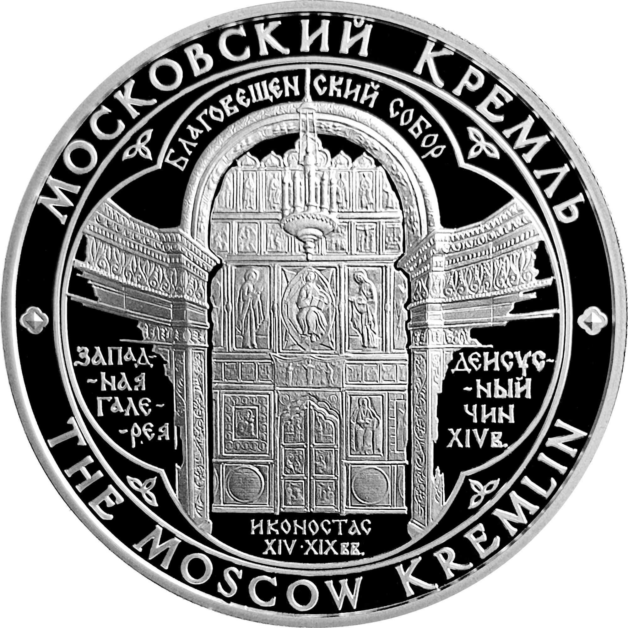 Благовіщенський собор був домашньою церквою російських царів, побудованою в кінці 15 століття (1484–1489) італійськими архітекторами. Медаль також містить написи.