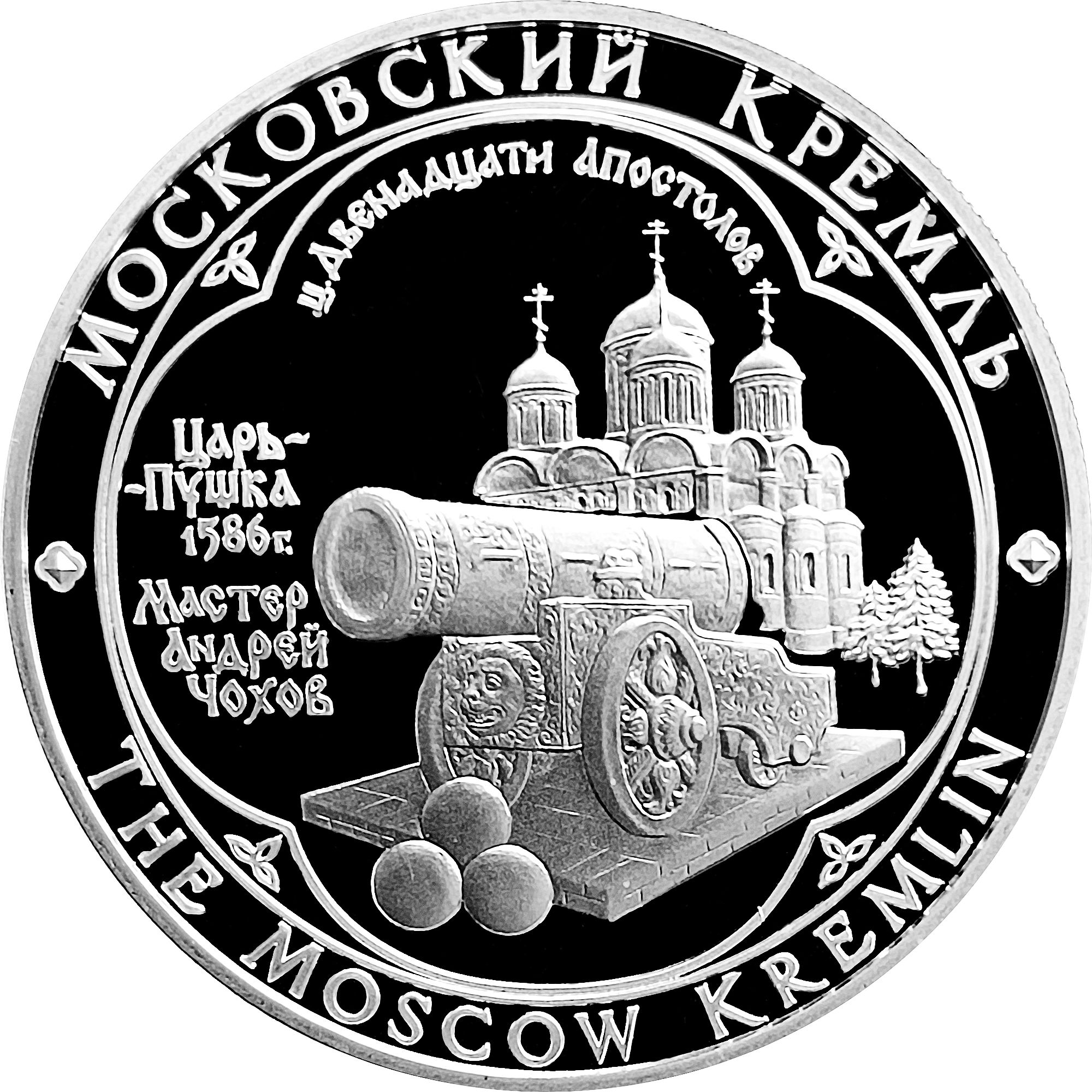 Описание: У центрі зображена Цар-гармата (1586), легендарна артилерійська установка, вилита майстром Андрієм Чоховим. Це одна з найбільших гармат у світі, вагою понад 39 тонн і калібром 890 мм. Вона ніколи не використовувалася в бою і зберігається в Кремлі. На задньому плані зображена Церква Дванадцяти Апостолів, архітектурна пам'ятка Московського Кремля, побудована в XVI і XVII століттях. Вона служила домашньою церквою московських патріархів і є частиною комплексу Патріаршого палацу. Медаль також містить написи.