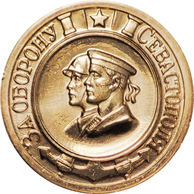 Описание: Медаль «За оборону Севастополя». Лівий профільний бюст червоношоломного моряка над червоношоломним солдатом. Внизу, виступаючи нижче краю центрального медальйона, нижня частина морського якоря та дула двох гармат переднього заряджання (перехрещуються під медальйоном); вгорі, виступаючи з центрального медальйона, дула двох гармат, між ними — рамка шириною 5 мм з рельєфною п'ятикутною зіркою. По периметру медалі, між краєм центрального медальйона і обідком медалі, рельєфний напис, зліва «ЗА ОБОРОНУ», а справа «СЕВАСТОПОЛЬ» (російською: «ЗА ОБОРОНУ») і (російською: «СЕВАСТОПОЛЬ»).