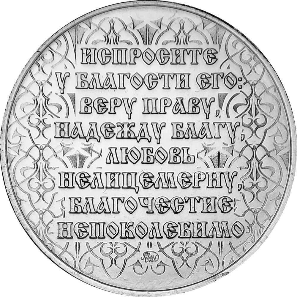 Описание: Рельєфні фрагменти молитов, адресованих святим Петру і Февронії. Також зображені знак монетного двору та декоративні орнаменти по краях, створені за допомогою лазерного гравірування. Молитва про духовні дари, зміцнення віри та чесноти.