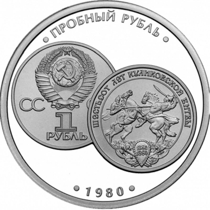 Описание: На зображенні — пробний рубль 1980 року, присвячений 600-річчю Куликовської битви. Рідкісна пам'ятна монета СРСР, яка не була випущена в масовий обіг. Вона була створена на честь перемоги російських військ під командуванням Дмитра Донського над армією Золотої Орди в 1380 році, яка стала символом зміцнення Московського князівства.