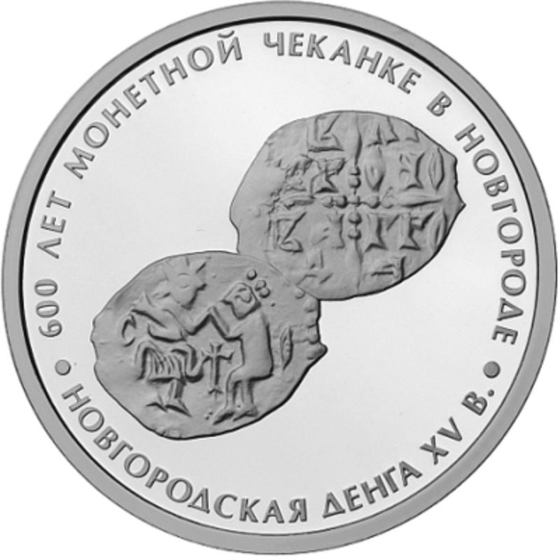 Описание: Зображено новгородську денгу (новгородку). Срібна монета, основна номінальна одиниця грошової системи Новгородської республіки. Випускалася з високоякісного срібла в XV столітті.