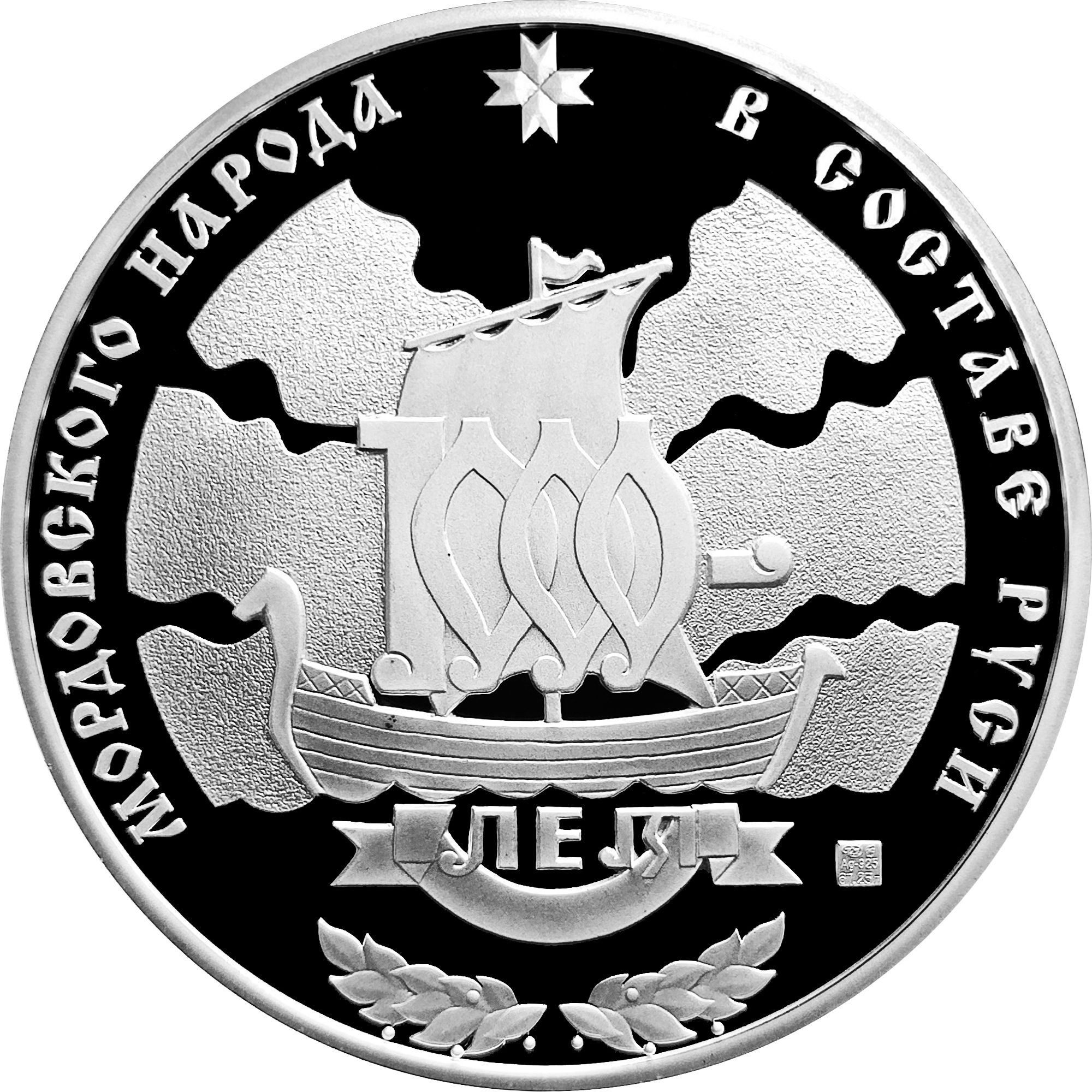 Описание: У центрі зображено човен, вітрила якого стилізовані під цифру 1000, що підкреслює тисячолітній ювілей. У верхній частині — восьмикутна зірка — традиційний слов'янський символ світла, єдності та захисту. Нижче — стрічка з написом, лаврові гілки та знак монетного двору. Напис уздовж краю медалі.